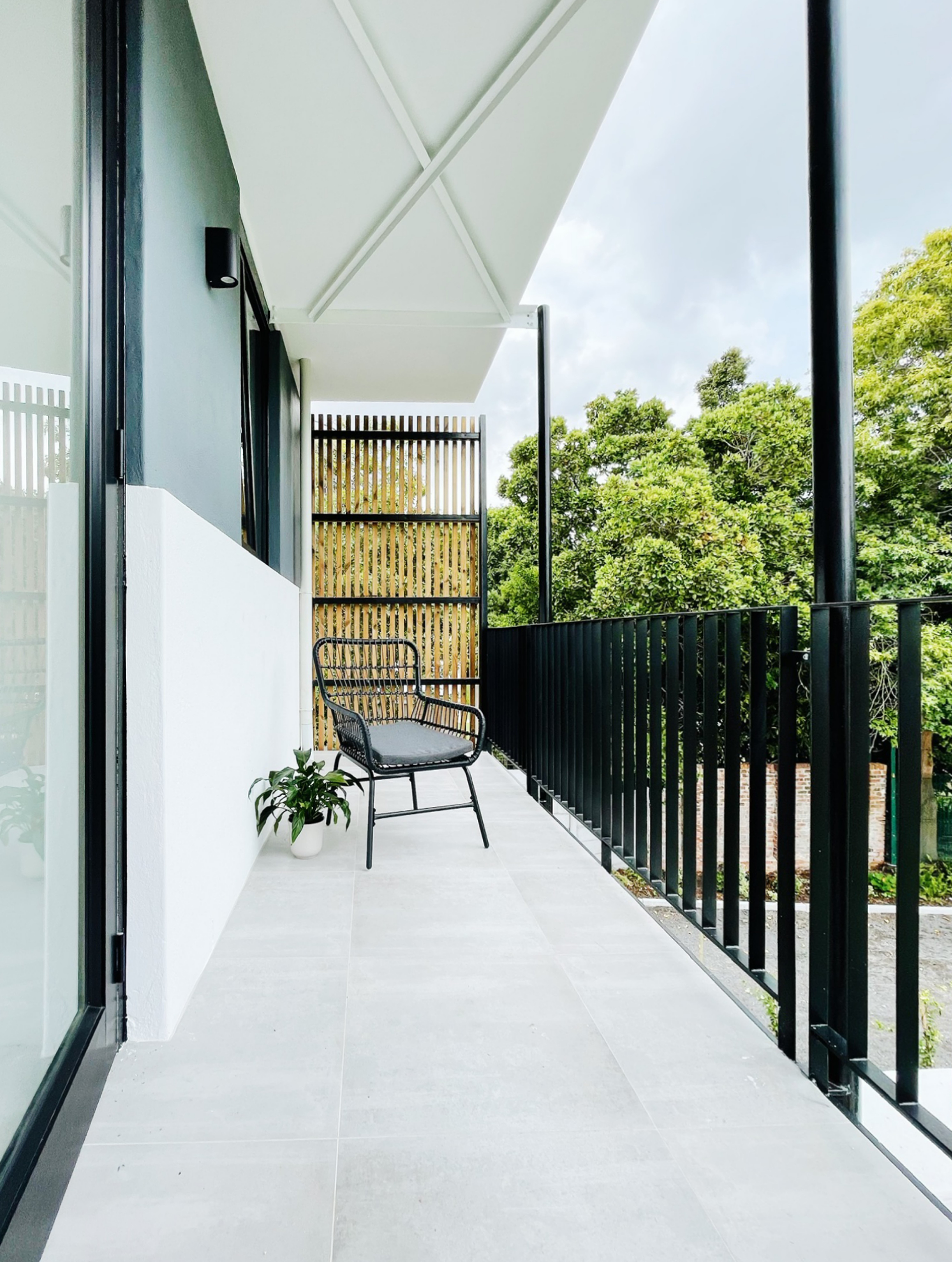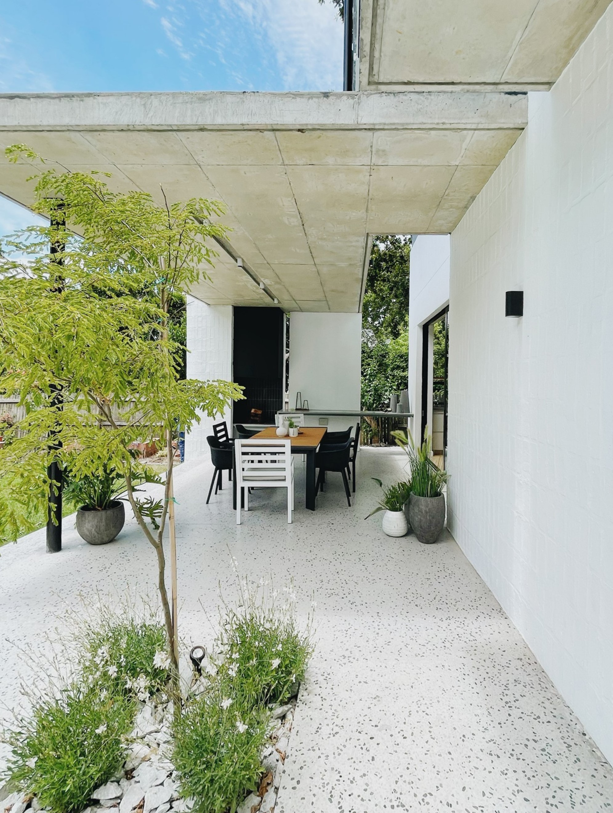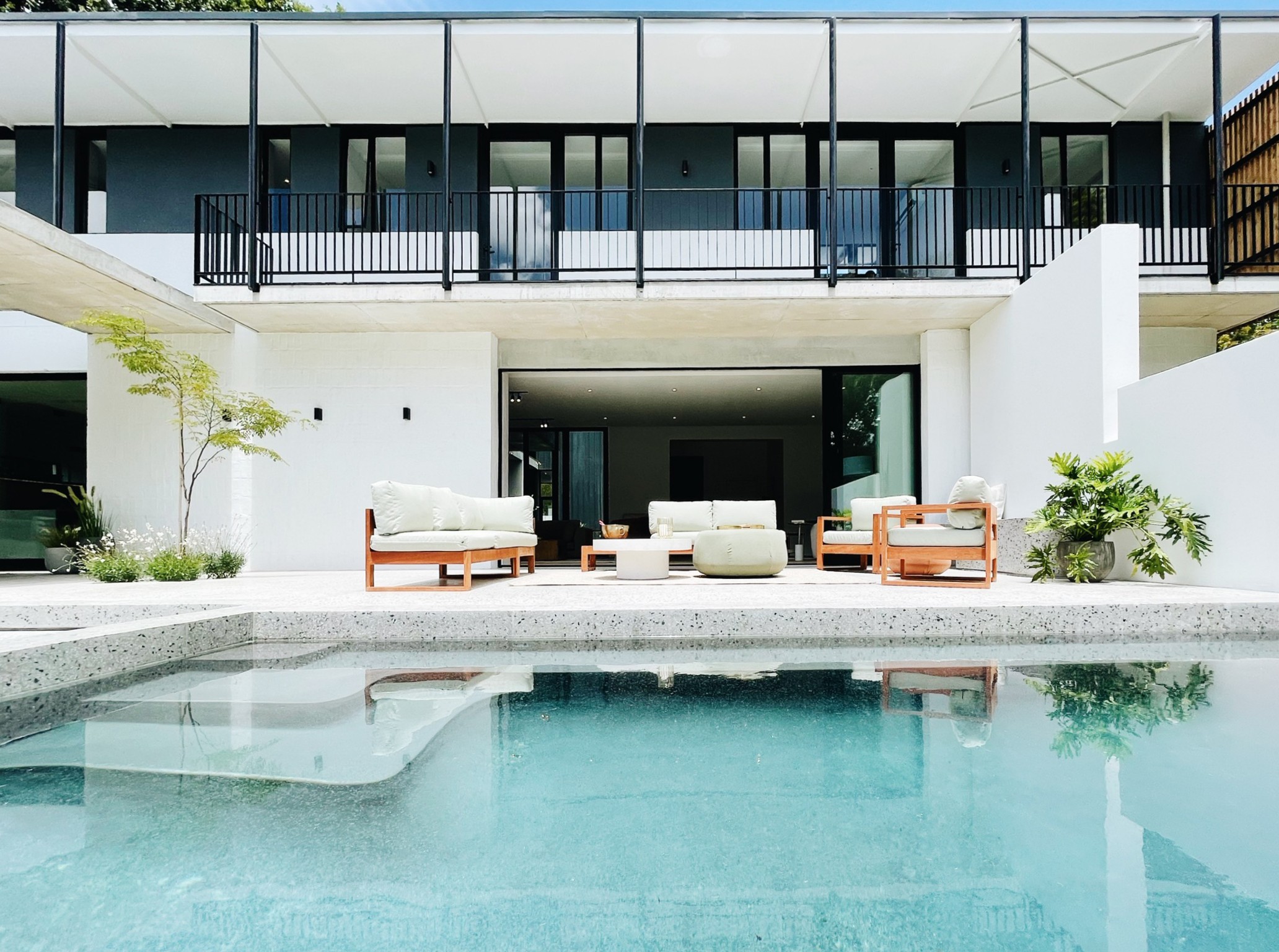 Upon entry, an intimate courtyard leads to the front door, offering a glimpse of the expansive, tree-rich garden beyond. Ground floor living spaces merge with a verandah that terraces down to a manicured lawn, blurring the boundary between indoors and out. On the opposite side, the study and guest suite open onto a sheltered courtyard, creating private, intimate zones.