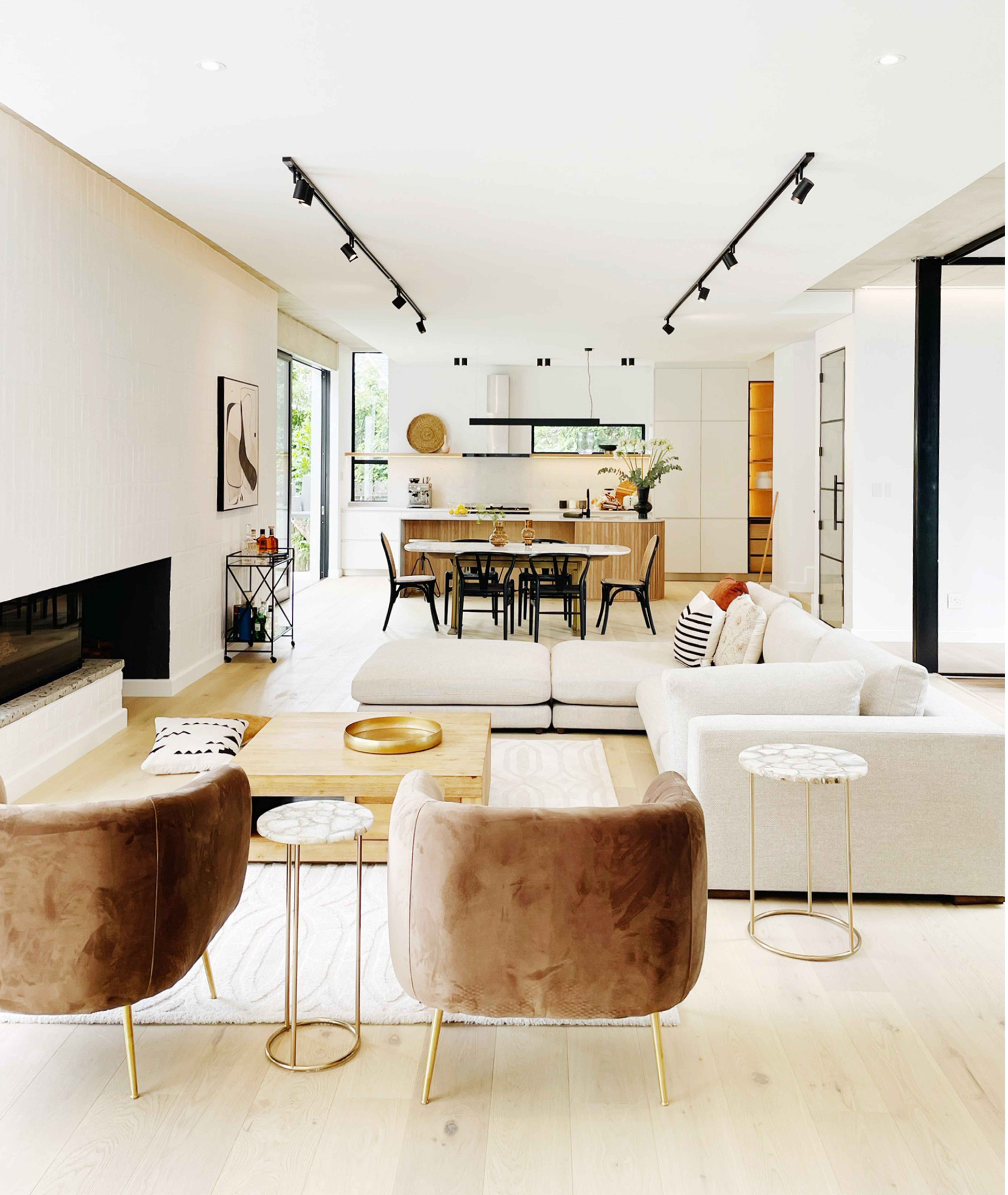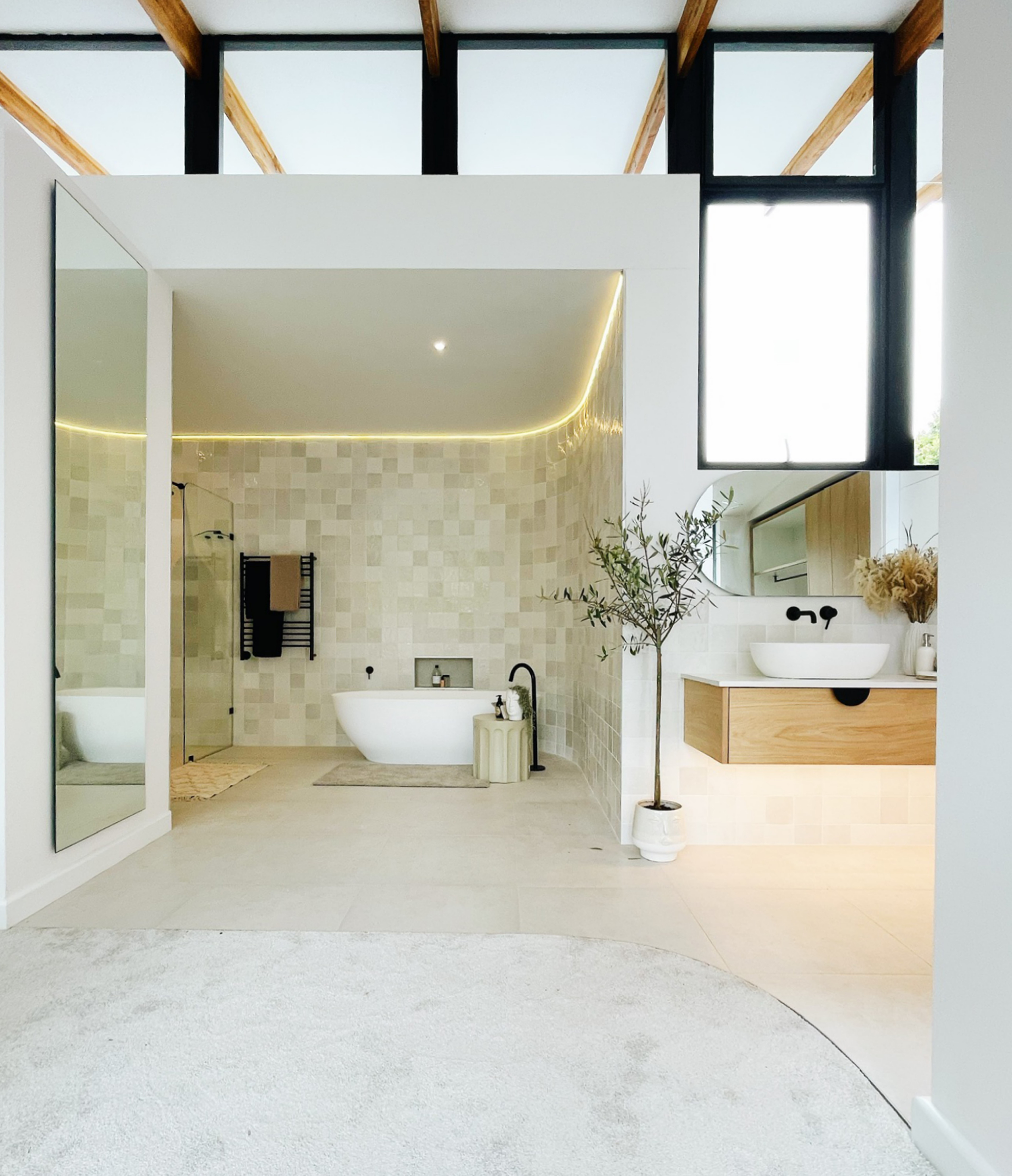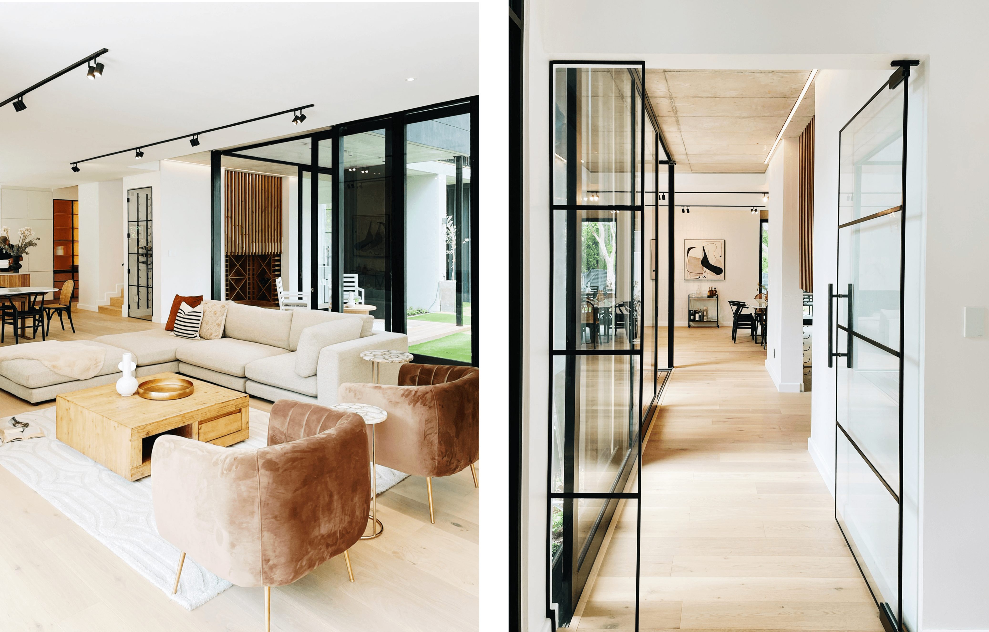 Upon entry, an intimate courtyard leads to the front door, offering a glimpse of the expansive, tree-rich garden beyond. Ground floor living spaces merge with a verandah that terraces down to a manicured lawn, blurring the boundary between indoors and out. On the opposite side, the study and guest suite open onto a sheltered courtyard, creating private, intimate zones.