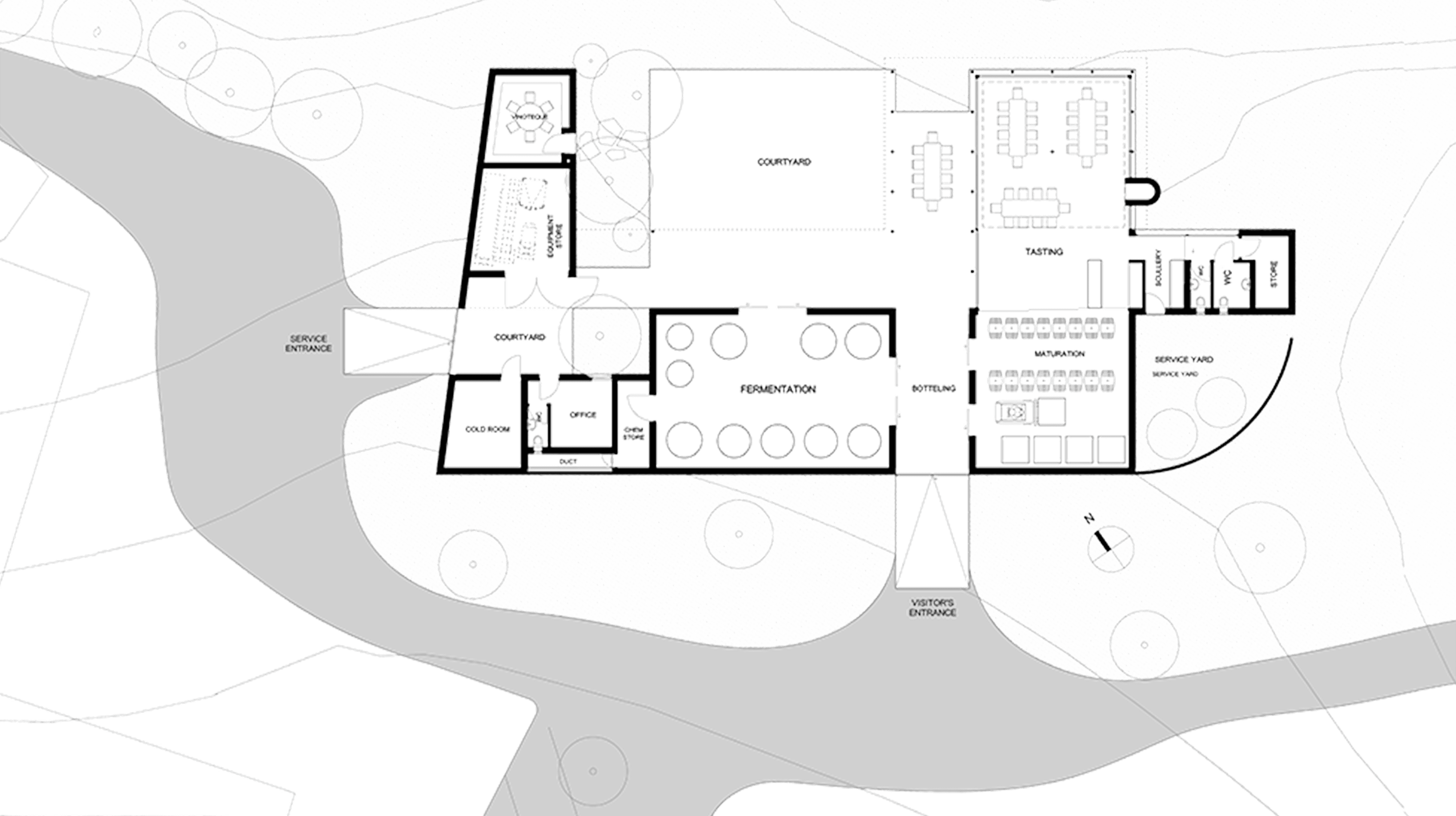 The 50-ton winery and tasting room includes a service entrance on the western side for deliveries, with cold storage and equipment facilities nearby. The working areas for destemming, crushing, fermentation, and maturation are thoughtfully arranged around the courtyard to optimize workflow and shield workers from the elements. Visitors are guided through the winemaking process, with a direct view from the restaurant into the maturation area, making the journey part of the experience.