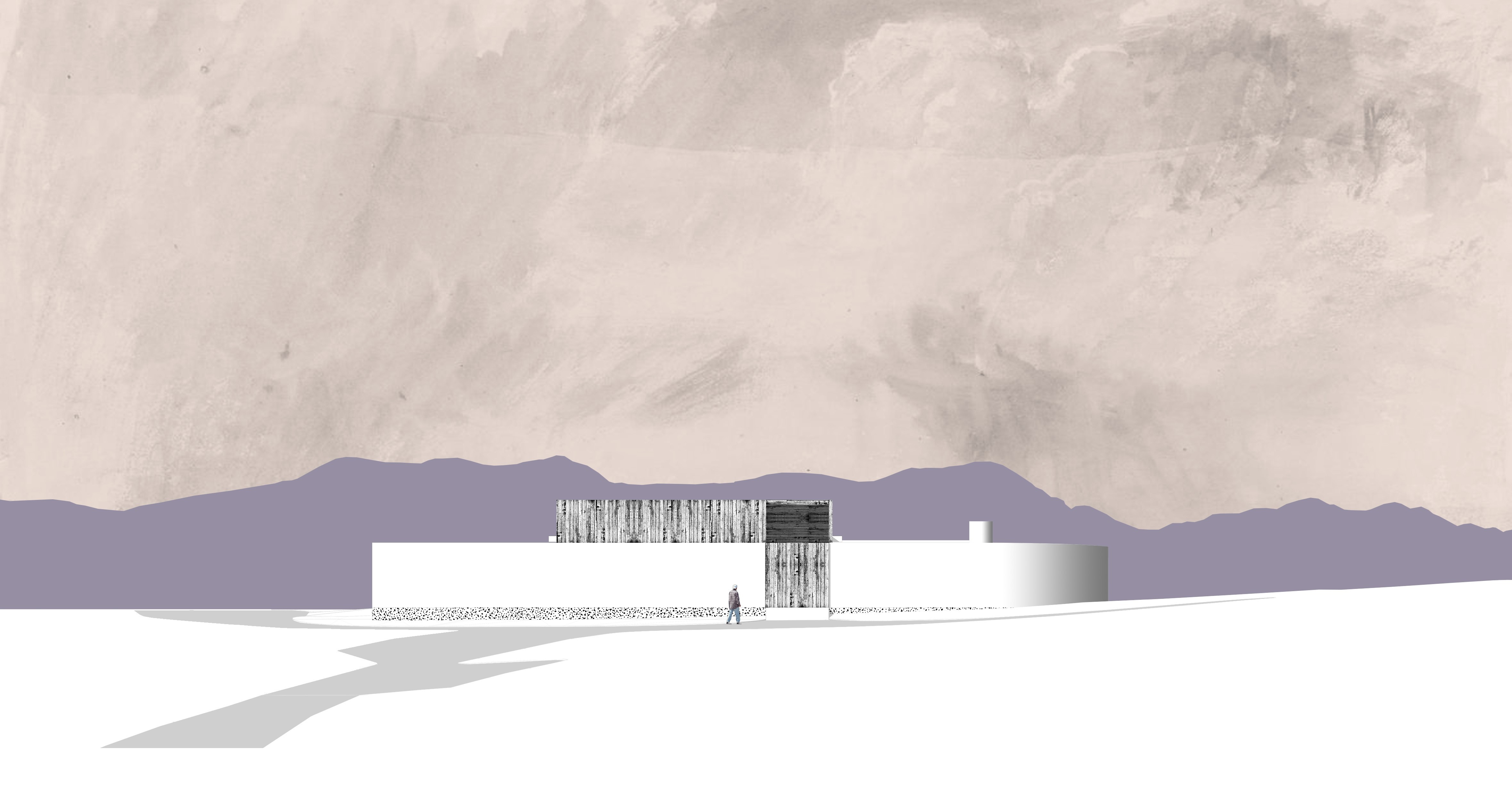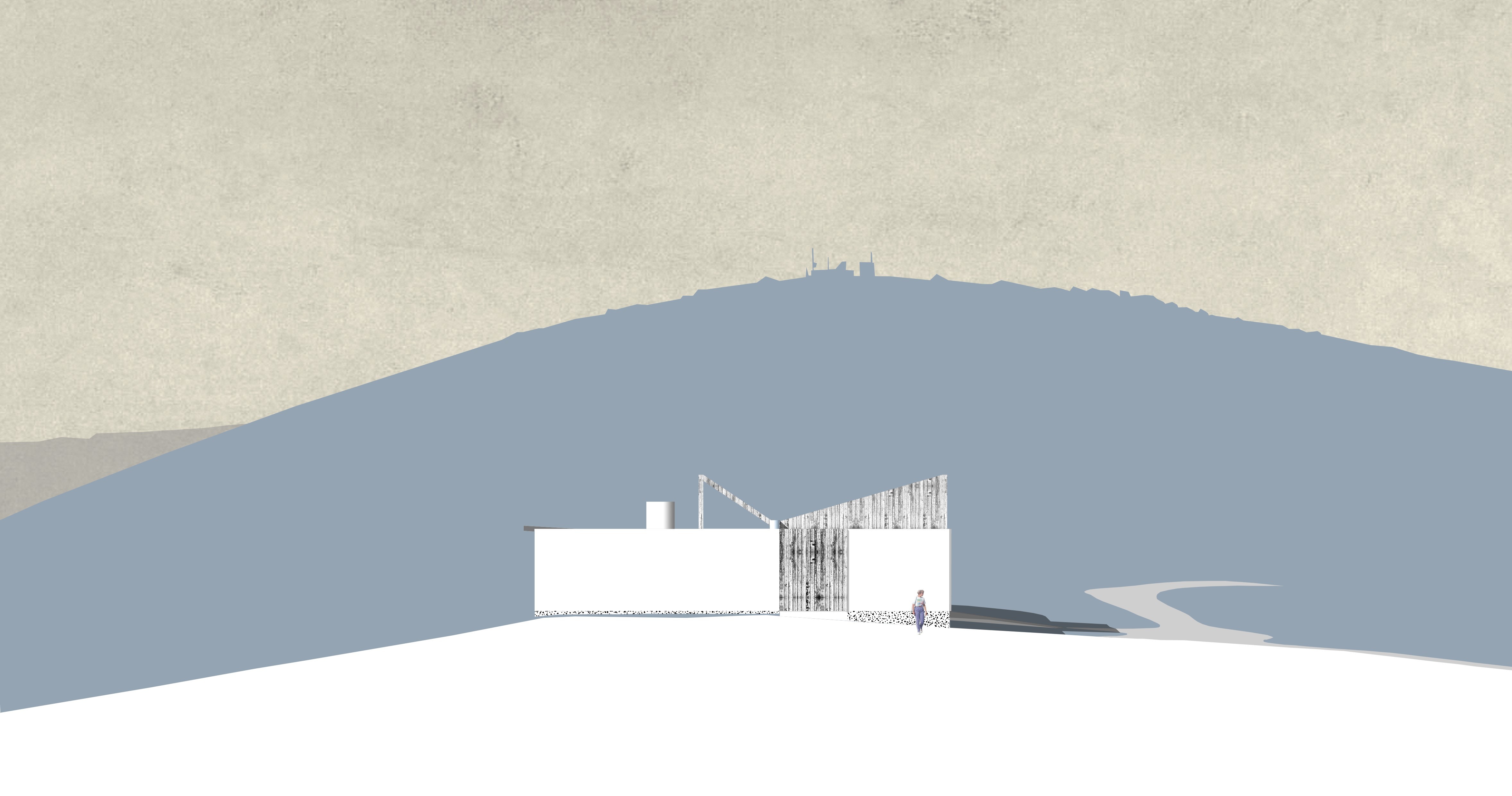 The building’s rustic elegance is expressed through white, rough-plastered walls atop stone floors and a stone plinth built with rock from the site. Timber elements and large sliding doors add warmth, blending rural simplicity with refined functionality.