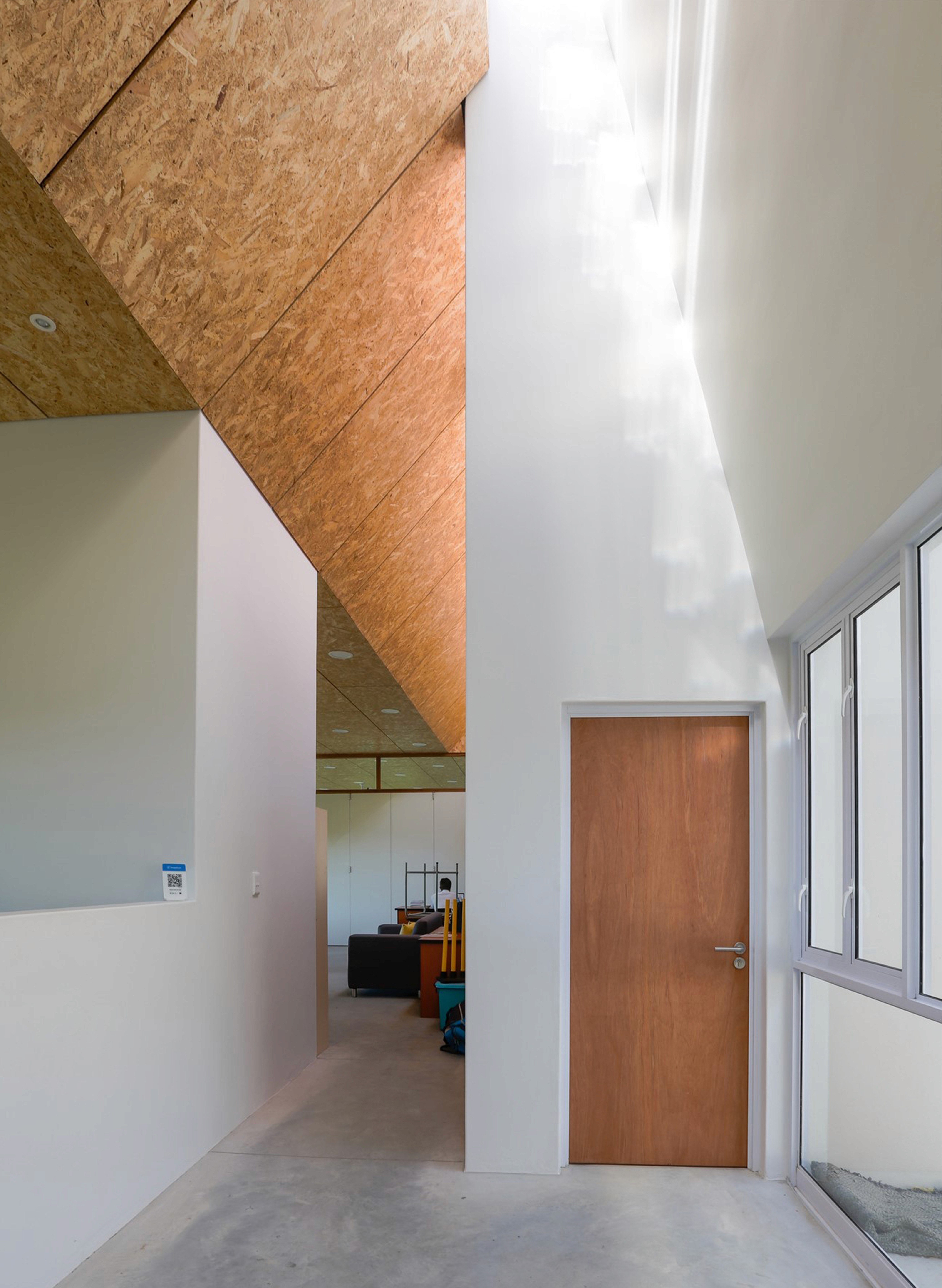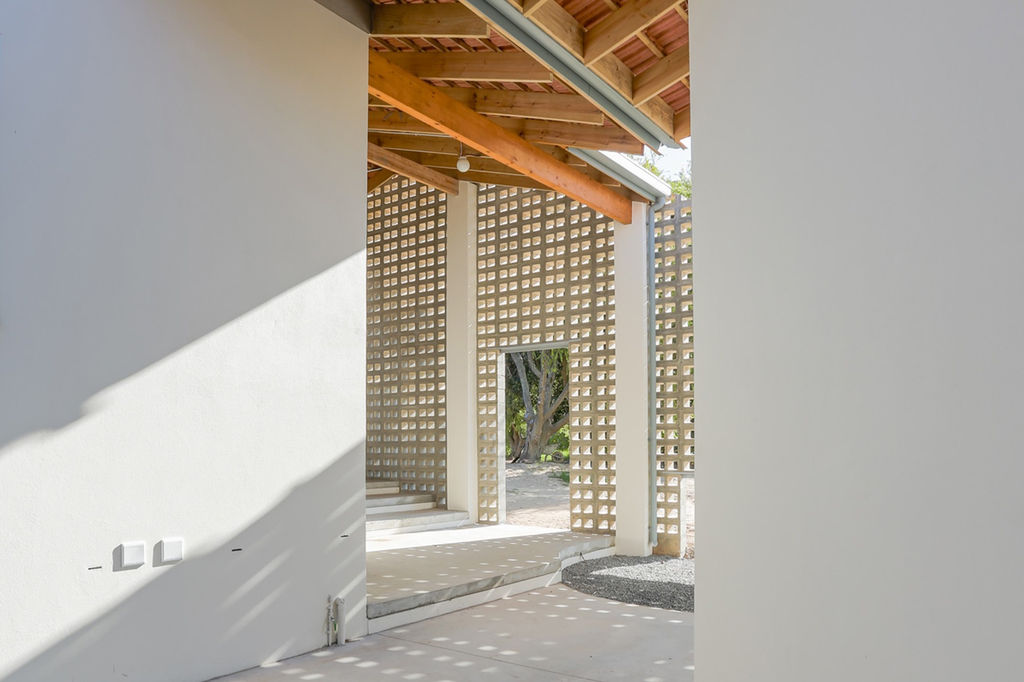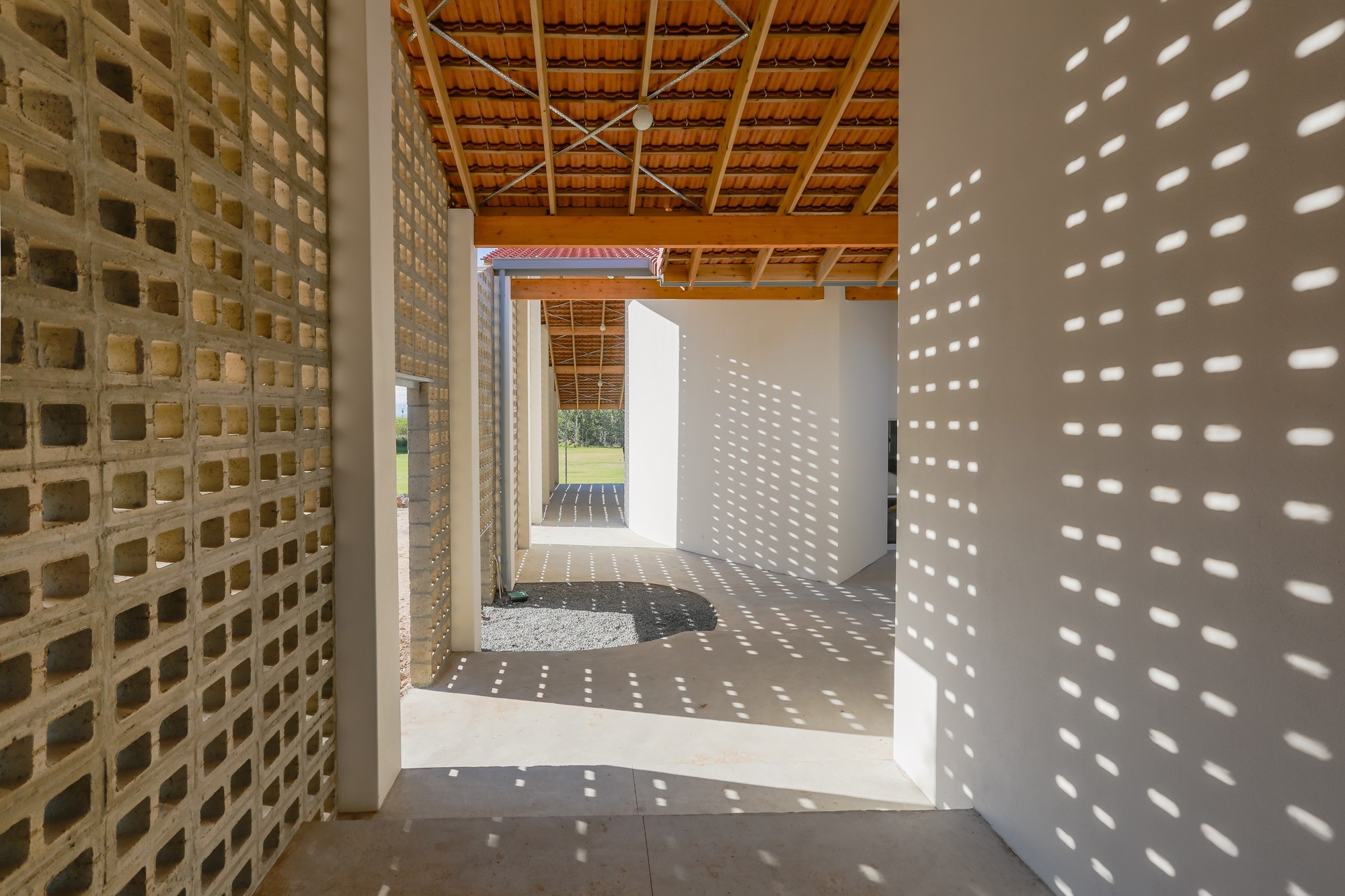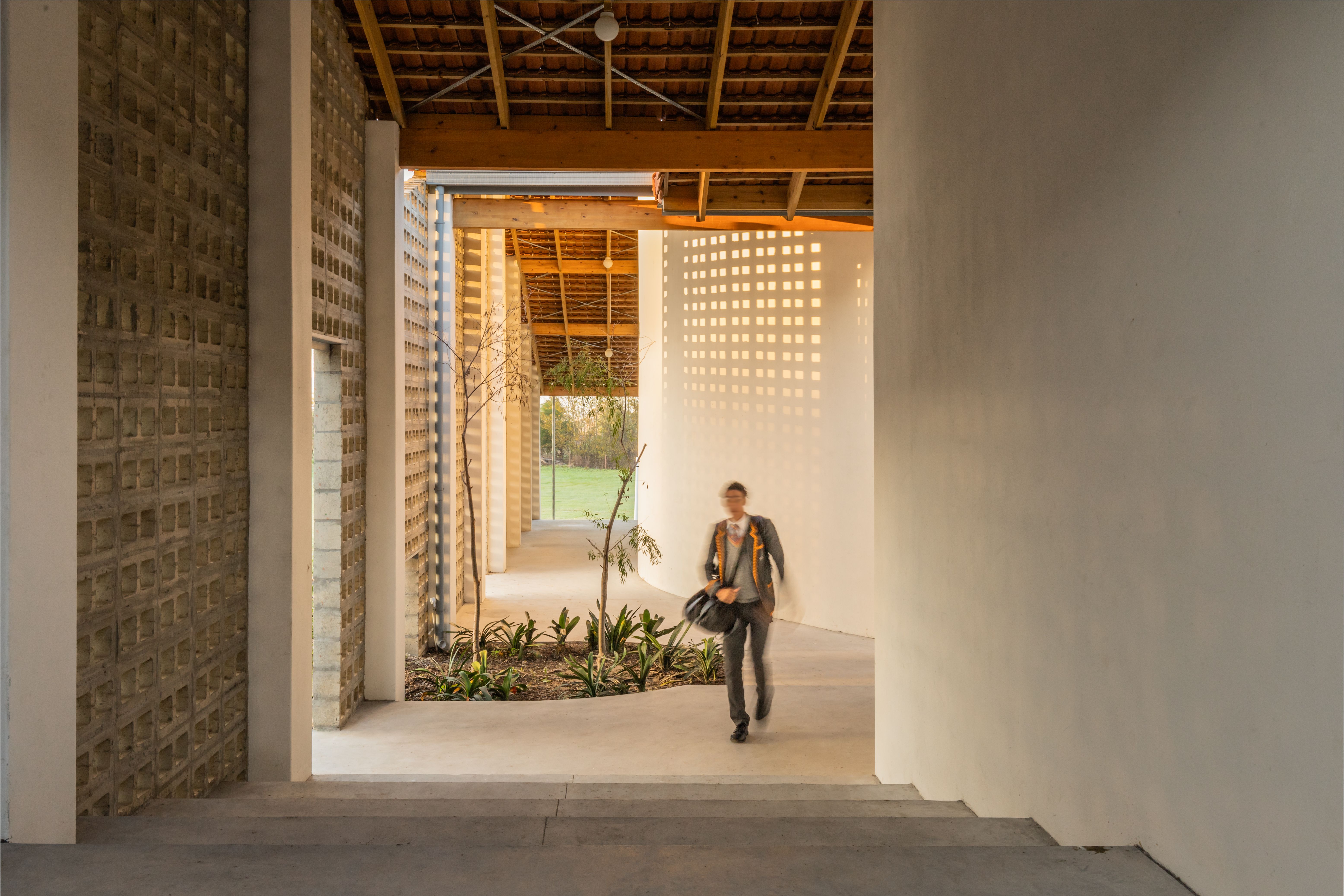 The articulation of the eastern facade declares a distinct feature to associate with the institution. A perforated concrete screen with two large openings that ushers learners into the school buildings through a threshold space that blurs boundaries between indoors and outdoors.