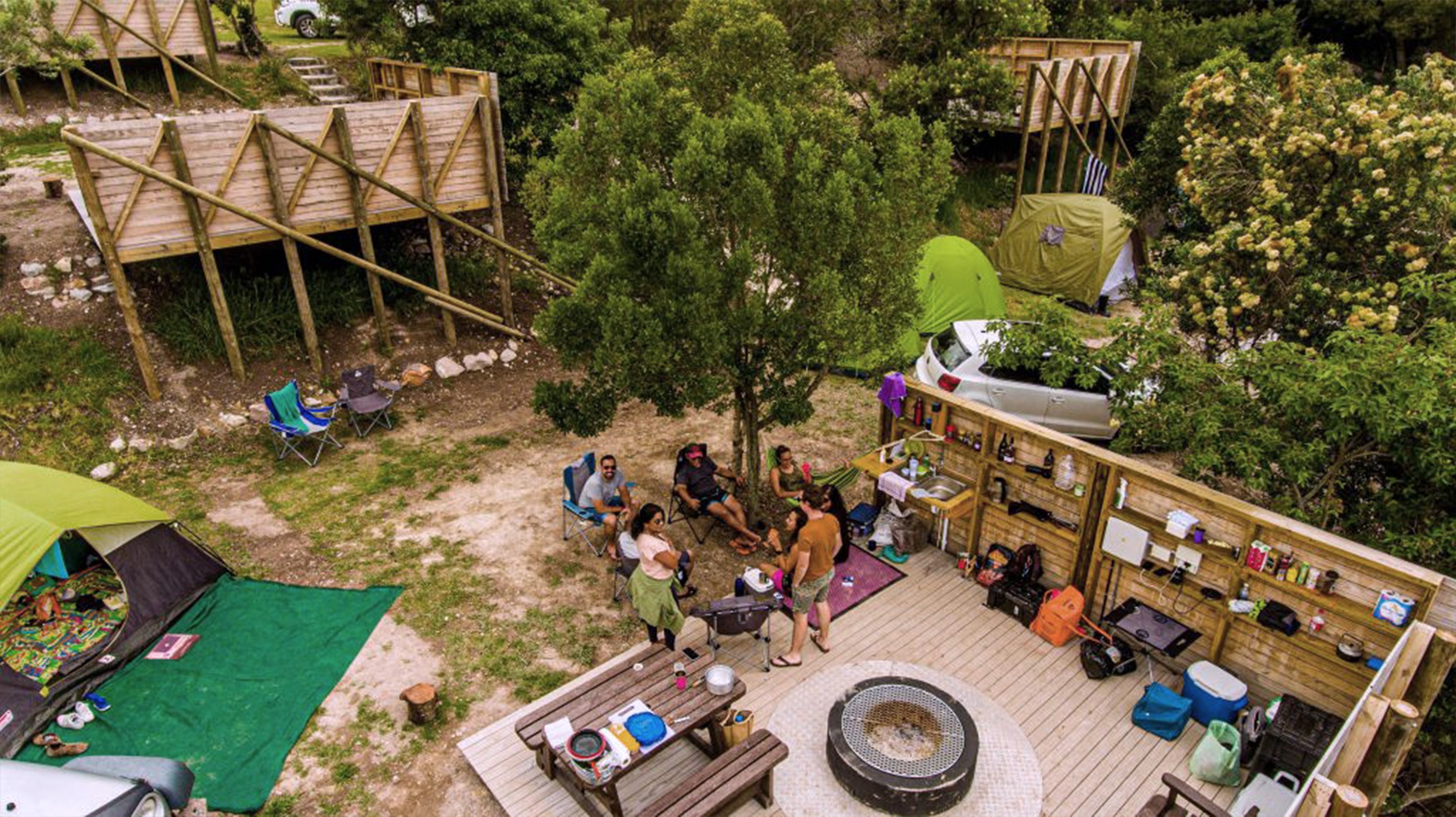 The decked campsite upgrade at Grootvadersbosch Nature Reserve transforms a steep, terraced site next to an indigenous forest into a vibrant and functional outdoor retreat. The project involved enlarging and configuring nine campsites, each designed to accommodate 4 to 6 people, by creating timber decked platforms that extend over the narrow terraces. These platforms allow for a more spacious and comfortable camping experience while minimizing environmental disruption. The design draws inspiration from the surrounding natural environment, with timber pole cross-bracing that references local bird hides.
