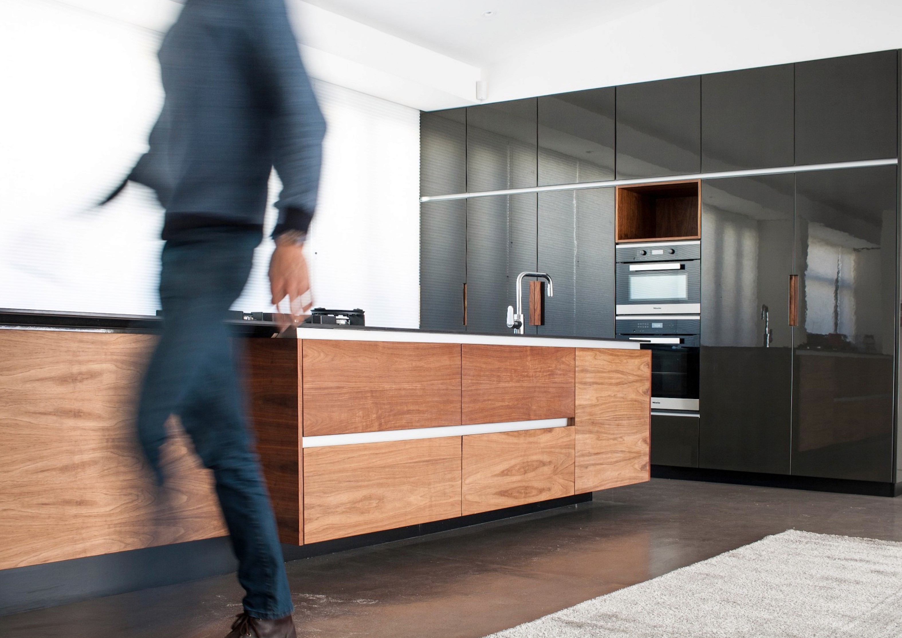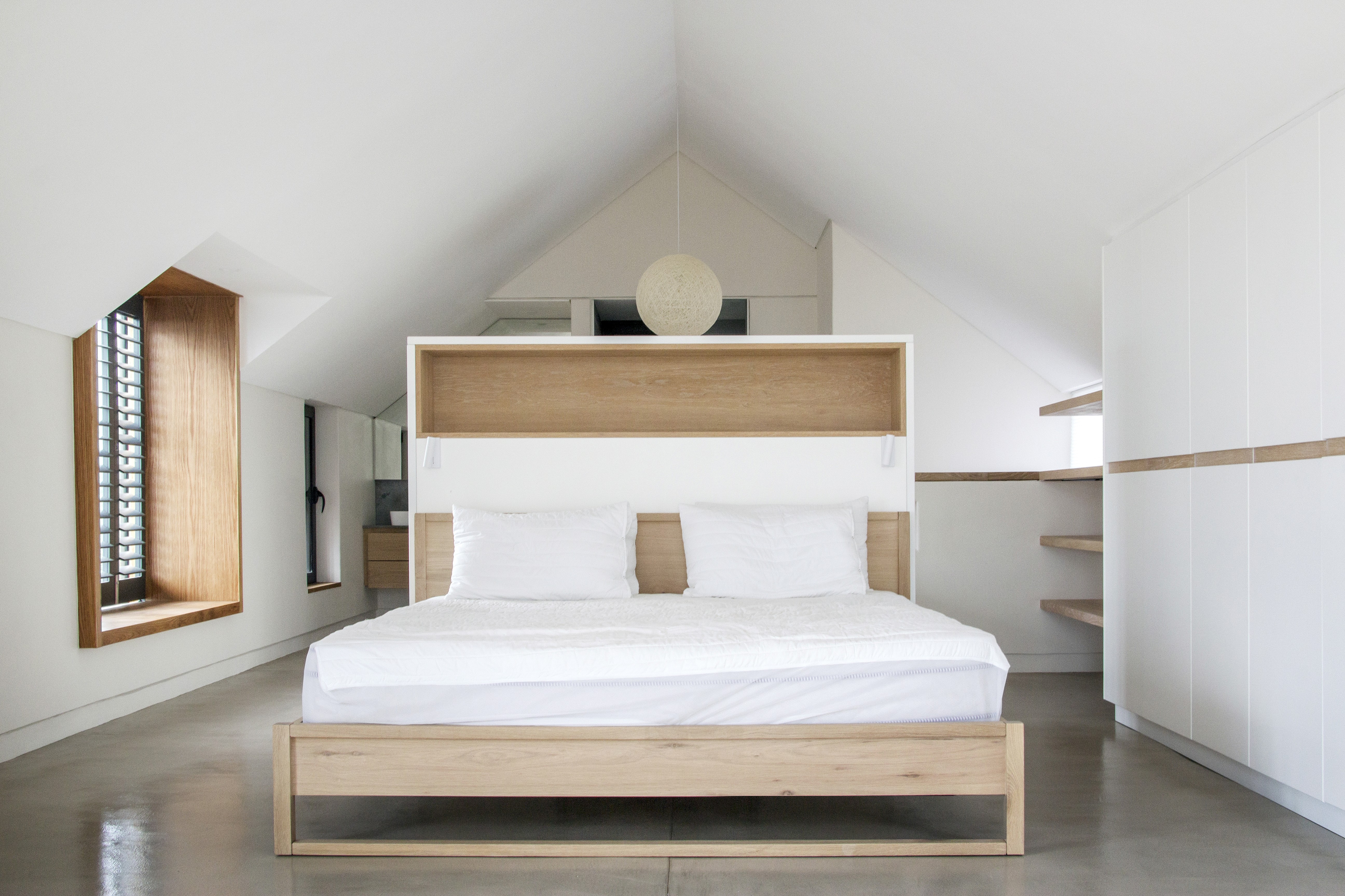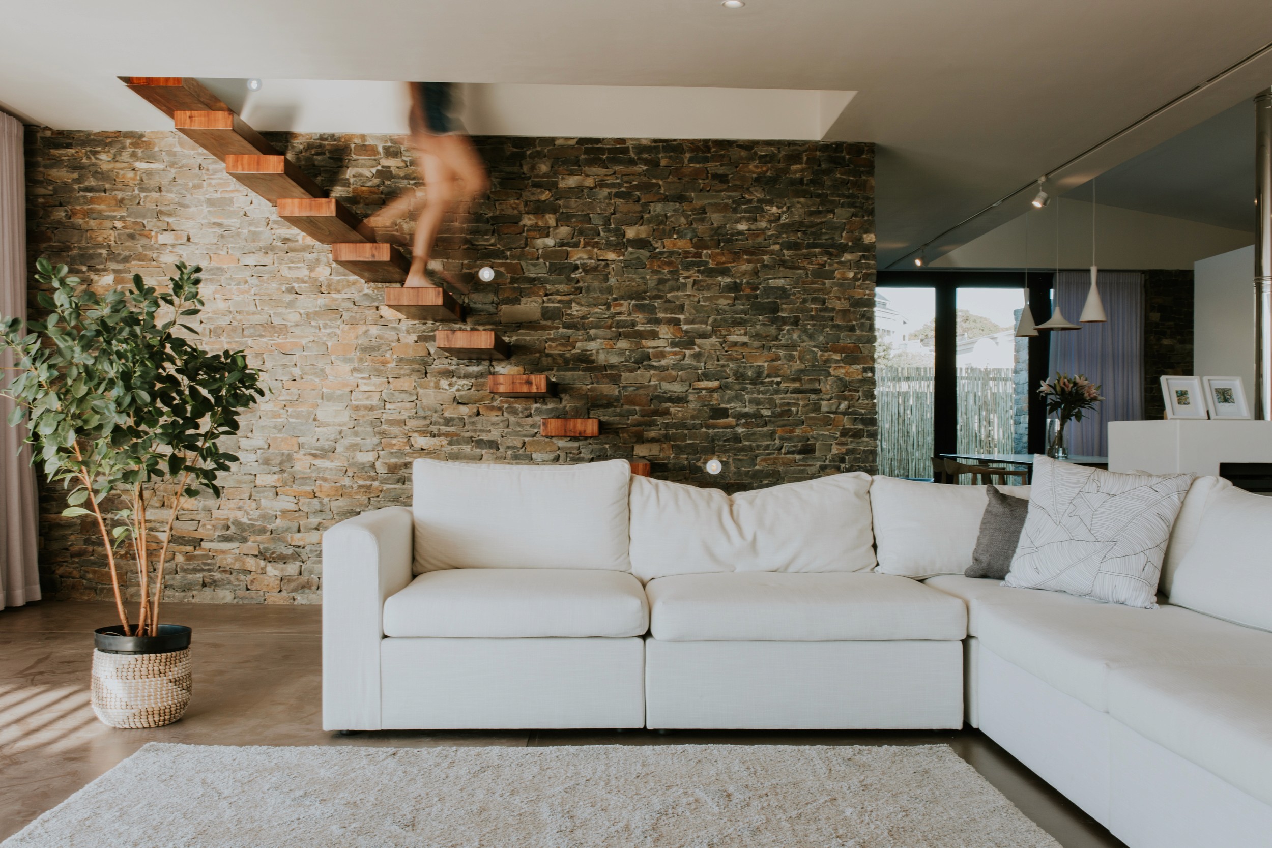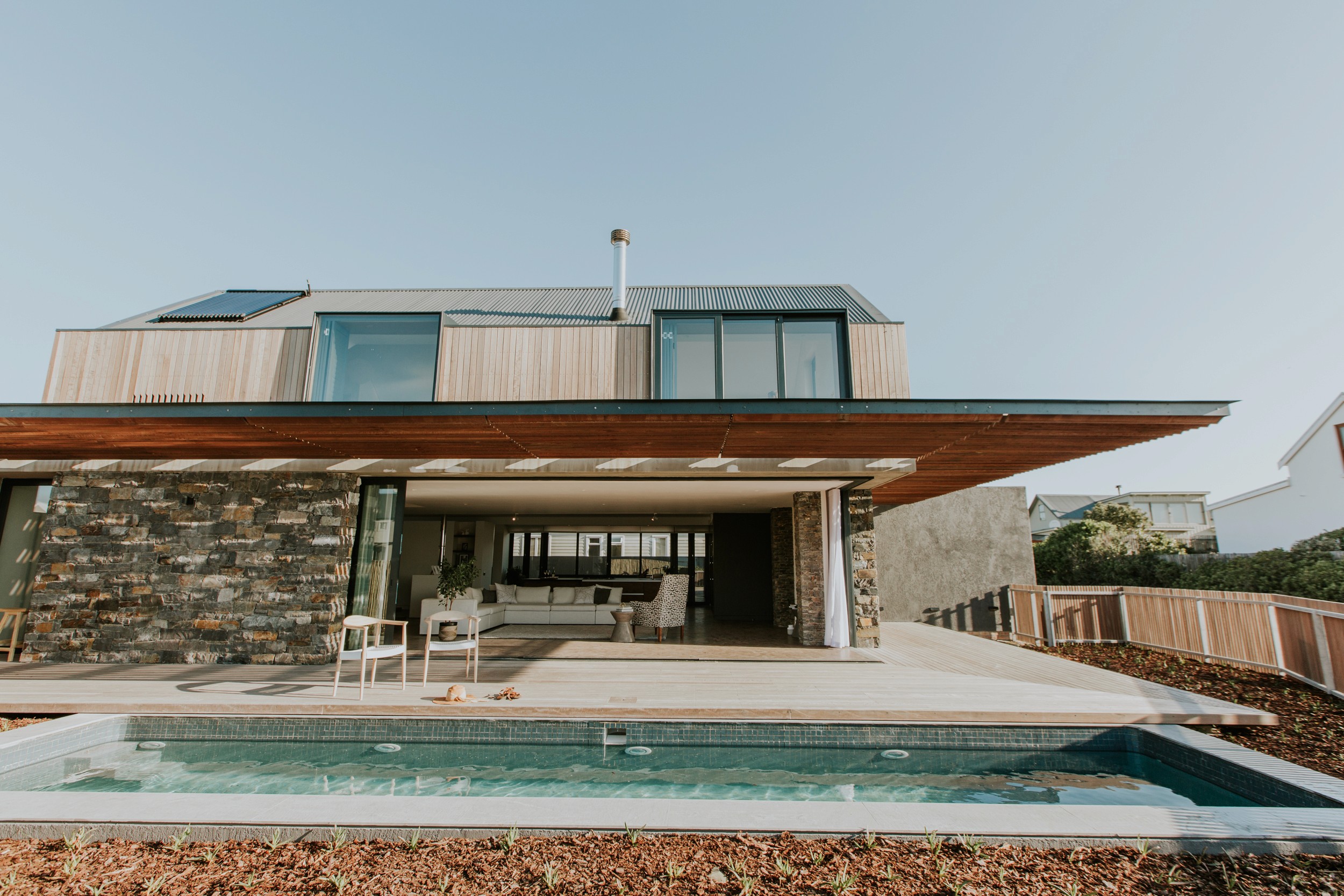 Inside, the open-plan ground floor integrates the living, dining, and kitchen areas, each differentiated by ceiling heights and natural light. The living room extends onto a wrap-around terrace along the public-facing façade, while the dining area transitions to a more intimate, sheltered outdoor zone with a fire pit. Overhead, a canopy of bent stainless steel plates forms a modern verandah, with timber louvres strategically angled to welcome winter sunlight while providing shade in the summer months.