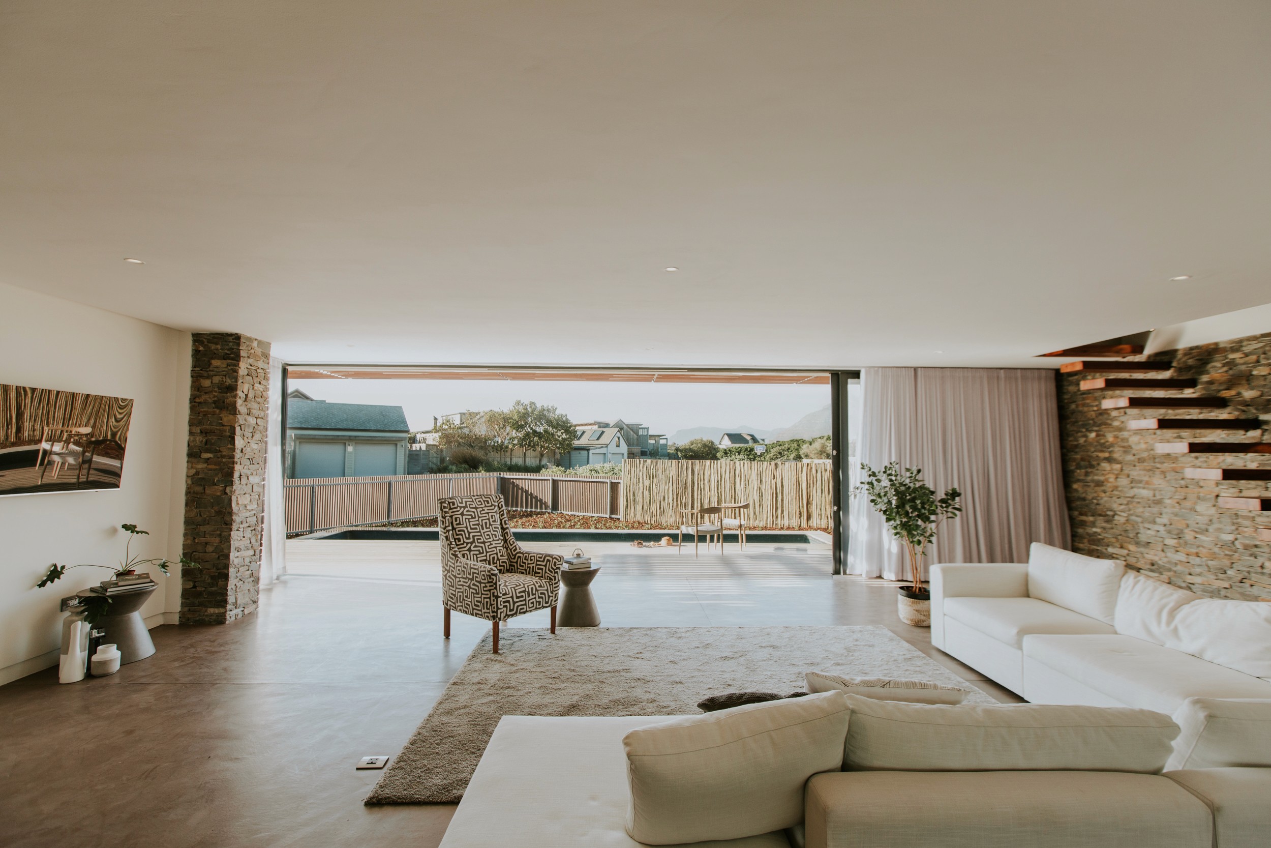 On the upper floor, the main bedroom, with its dormer windows and cozy bay seating, frames picturesque views of Hout Bay’s mountains. Timber cladding on this level adds warmth and texture, complementing the home’s contemporary architectural language.